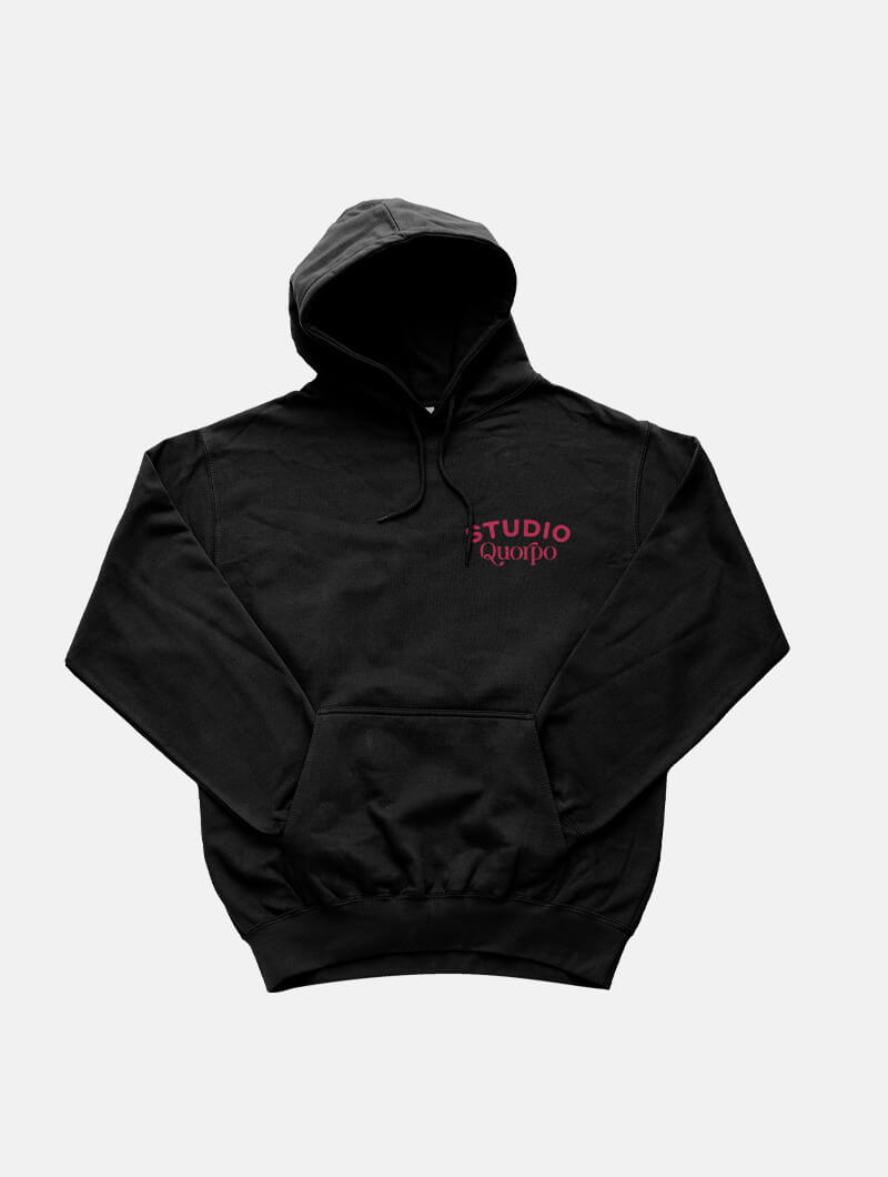 Sweat à capuche à coupe large en coton biologique. Sérigraphie manuelle à l’avant, côté coeur, et à l’arrière.